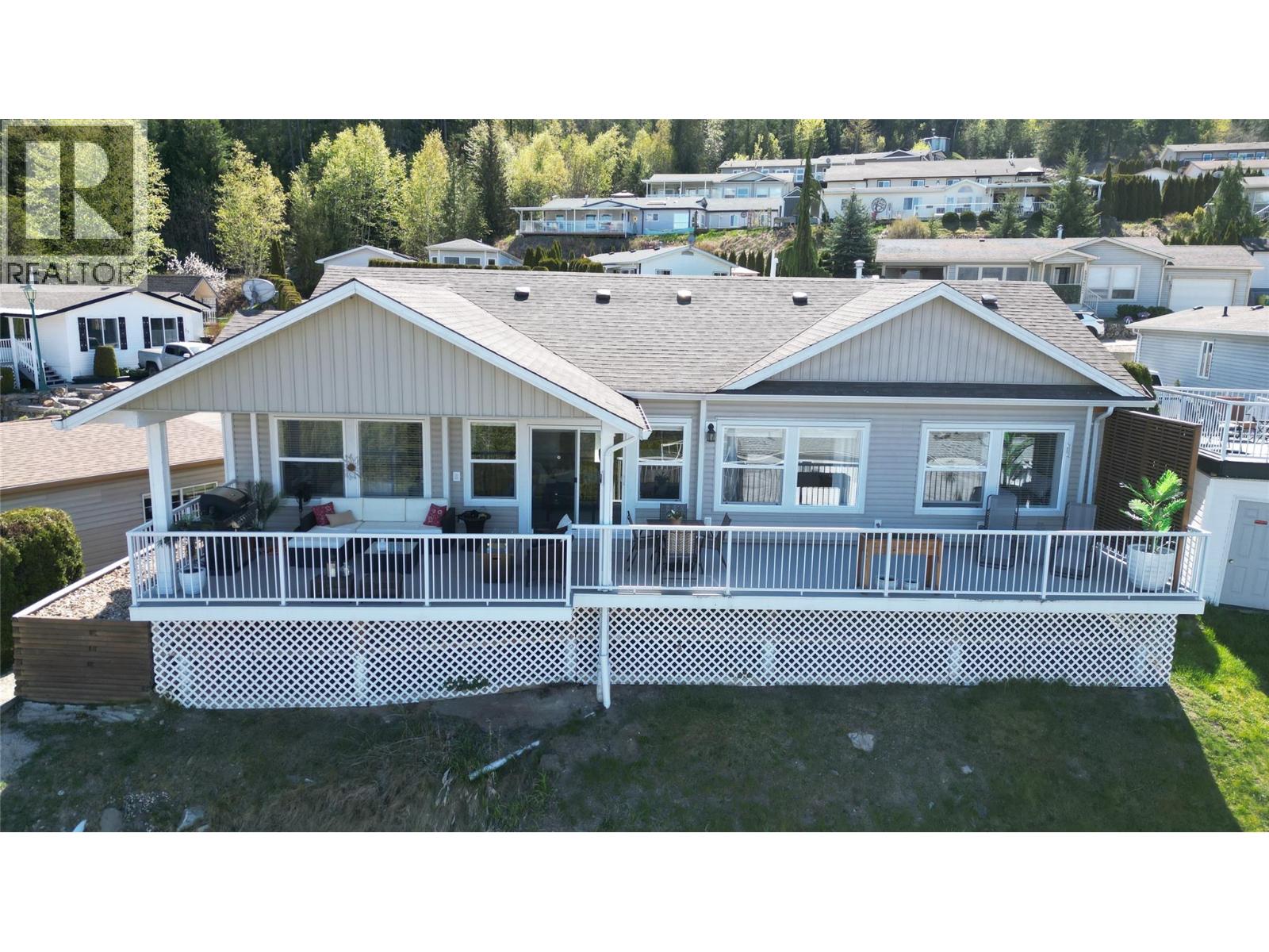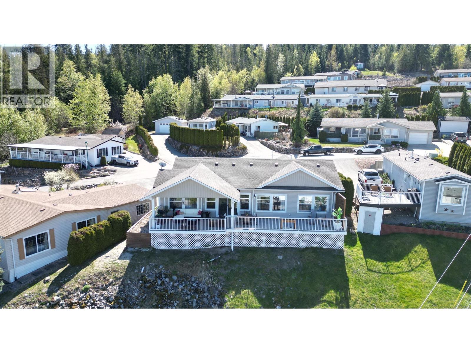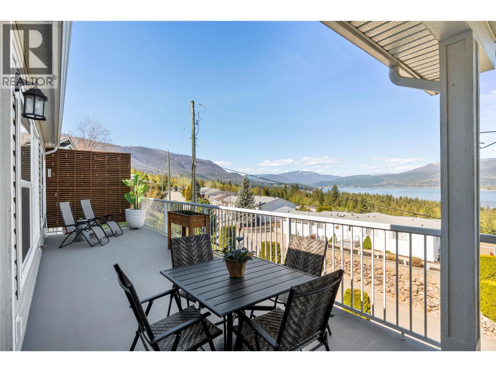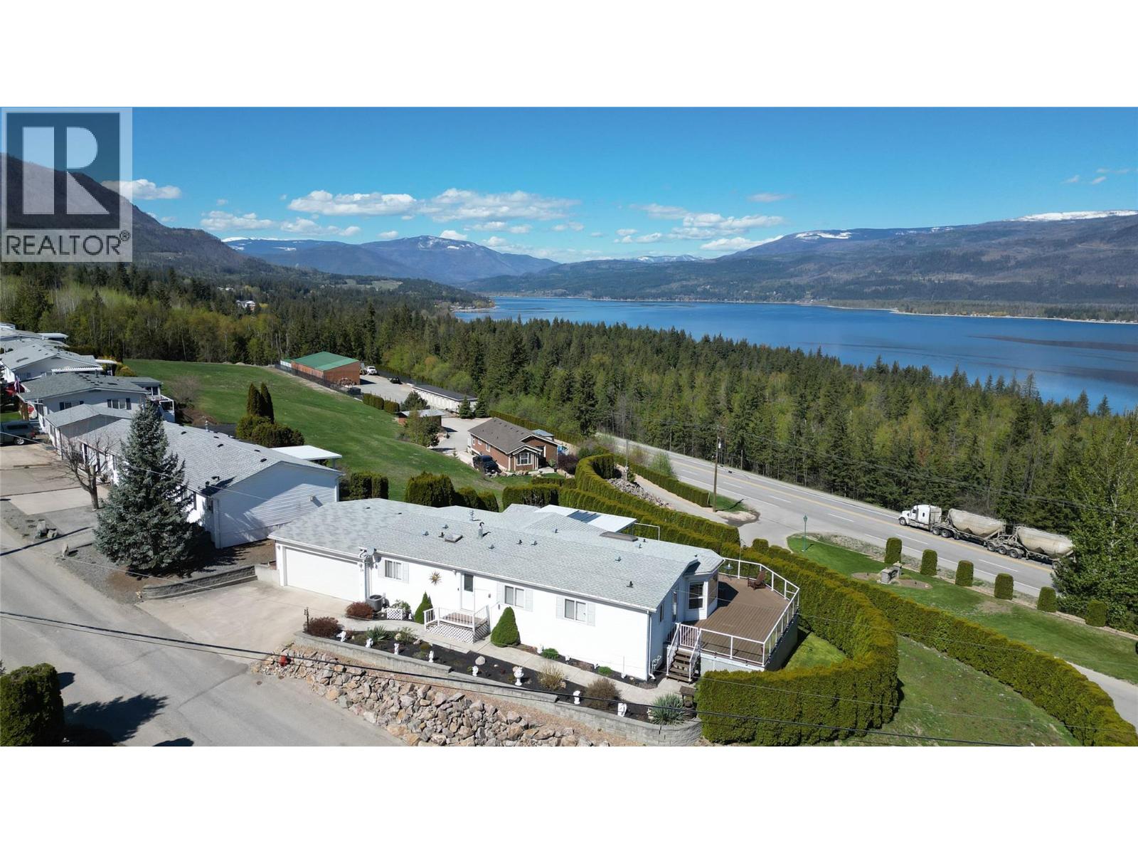 Breathtaking lake and mountain views from this meticulously maintained 2 bedroom, 2 bathroom modular home located in Sorrento's Deer Ridge Estates, a 55+ and quiet community. This home offers an excellent floorplan with bedrooms on opposite ends of the home and and open concept living room and kitchen. Enjoy your morning coffee on the large 50' wide partially-covered deck with panoramic views of Shuswap Lake. The spacious master bedroom features a full ensuite with a large walk-in glass shower. The bright kitchen is upgraded with stainless steel appliances, built-in microwave, and raised breakfast bar. The home, sitting on a full concrete crawl-space, is located on a quiet cul-de-sac and is just minutes from all necessities and recreation the Shuswap offers. Additional highlights include natural gas forced-air heating and air conditioning as well as a natural gas fire table on the deck, included in the sale. The 55+ park with friendly atmosphere allows pets, including dogs up to 10 kg (some restrictions apply). (id:25164)